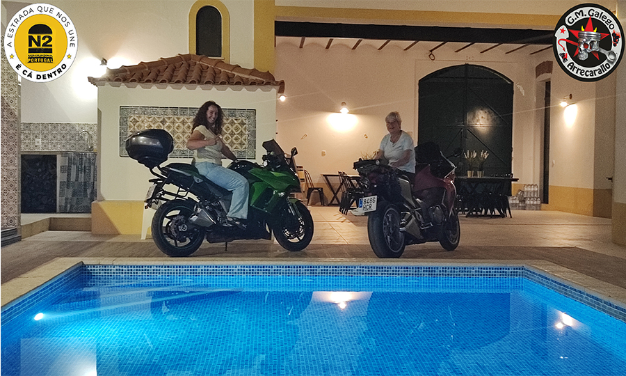 Seguimos o percorrido cando xa nos faltaban dúas parada para o remate da etapa, decatámonos que en teoría a roda traseira da vfr 1200 que debía chegar a Faro, esta apunto de mostrar os alambres, en parte devido a que xa estamos no sur de Portugal, as carreteira sa son rectas infinitas e as temperaturas extremas, nestas alturas nalgún pobo de parada, fixámonos nos termómetros que marcan os 46º, daquela decídemo buscar hotel antes de completar a terceira etapa, que seria en Ferreira do Alentejo, desviámonos a durmir a Alvito, onde durmimos nun dos mellores hoteis de toda a ruta, pola noite xa despois de cear buscamos o sitio mais cércano onde poder cambiar a roda, despois piscina relax e a descansar.